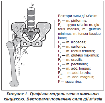 Для об’єктивізації балансу м’язових зусиль, необхідних для підтримки рівноваги таза при одноопорному стоянні до та після ендопротезування диспластичного кульшового суглоба, нами була використана математична модель [11–13], яка відображала таз із стегновою кісткою та вектори дії м’язів двох груп: абдукторів та аддукторів стегна (рис. 1).