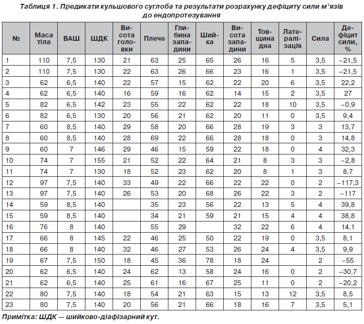 У пацієнтів з диспластичним коксартрозом було розраховано рівень дефіциту м’язової сили до оперативного лікування з використанням моделі горизонтальної рівноваги таза. Дані розрахунку наведені в табл. 1.