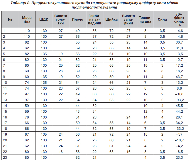 Після ендопротезування кульшового суглоба за даними рентгенометрії були отримані нові анатомічні і рентгенометричні параметри кульшового суглоба. За ними за допомогою моделі горизонтальної рівноваги таза також було розраховано рівень дефіциту сили м’язів. На відміну від попереднього розрахунку не враховували латералізацію центру обертання головки стегна та больовий фактор, які були усунені при ендопротезуванні (табл. 2).