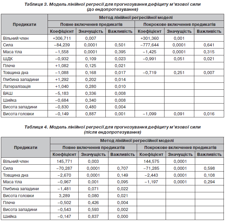 Розроблені лінійні регресійні моделі дозволяють прогнозувати дефіцит сили м’язів пацієнтів до та після ендопротезування. Розроблені регресійні моделі можуть використовуватися як інструмент для оцінки реабілітаційного прогнозу. Для всіх регресійних моделей найбільш вагомими є дані щодо сили м’язів пацієнта до операції та маса тіла. Іншим важливим показником є товщина дна вертлюжної западини. З урахуванням того, що товщина дна є анатомічним показником і при ендопротезуванні можлива лише обмежена його зміна, основними параметрами для варіювання є маса тіла пацієнта та сила м’язів.