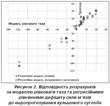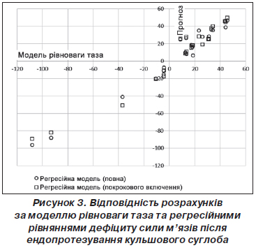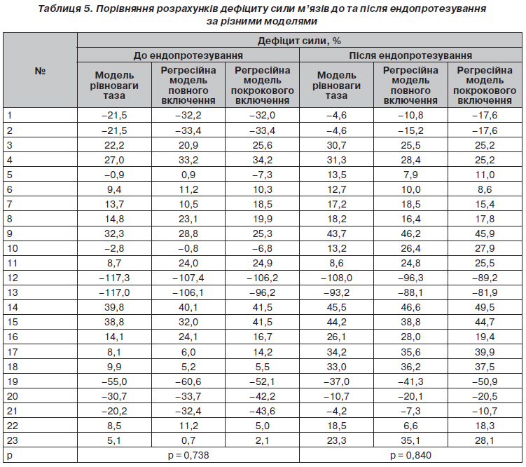 Повна, із включенням всіх предикатів, модель та модель з покроковим включенням дали однакові результати. У табл. 5 наведені результати розрахунку дефіциту сили м’язів до та після ендопротезування за моделлю горизонтальної рівноваги таза та за регресійними моделями.