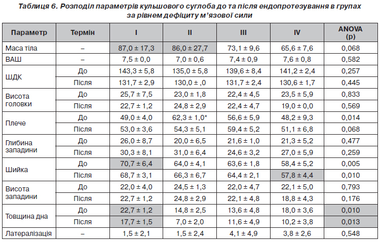 Для визначення впливу параметрів кульшового суглоба і пацієнтів на результат ендопротезування було проведено порівняння між групами (табл. 6).