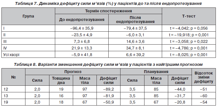Ендопротезування кульшового суглоба, навіть у випадках неповного відновлення функціональності, поліпшує силову здатність пацієнтів. Результати порівняння дефіциту сили м’язів до та після ендопротезування кульшового суглоба наведені в табл. 7.