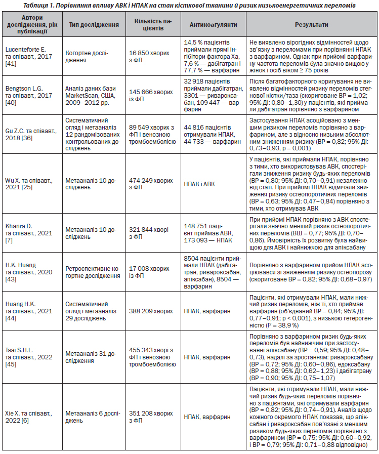 Актуальність. Остеопороз є актуальним питанням сьогодення, оскільки впливає на якість і тривалість життя хворих, підвищує ризик низькоенергетичних переломів, що призводить до значних медичних, соціальних і економічних проблем. Однією з причин розвитку вторинного остеопорозу є застосування антагоністів вітаміну К і нових пероральних антикоагулянтів, використання яких зростає. Метою цього систематичного огляду був аналіз літературних даних стосовно впливу пероральних антикоагулянтів на стан кісткової тканини, ризик розвитку остеопорозу та його ускладнень з метою поліпшення поінформованості лікарів різного фаху. Матеріали та методи. Огляд наукової літератури проводили на основі аналізу міжнародних електронних наукометричних баз даних PubMed, Google Scolar, Scopus за період 2013–2023 рр., але з нього не виключали основні роботи, опубліковані раніше. Пошук здійснювали два незалежні автори. Для аналізу було відібрано 160 джерел, з них використано 53, які відповідали критеріям пошуку. Результати. Аналіз наукових робіт продемонстрував, що вплив антагоністів вітаміну К і нових пероральних антикоагулянтів на кісткову тканину та ризик розвитку низькоенергетичних переломів суперечливий. При порівнянні антагоністів вітаміну К і нових пероральних антикоагулянтів показано, що при використанні останніх спостерігали менший ризик розвитку малотравматичних переломів. Висновки. Більшість досліджень продемонстрували несприятливий вплив антагоністів вітаміну К на стан кісткової тканини. При прийомі нових пероральних антикоагулянтів спостерігали нижчий ризик переломів, ніж при використанні антагоністів вітаміну К, зокрема варфарину. З огляду на проаналізовані дані літератури рекомендовано при призначенні антагоністів вітаміну К чи нових пероральних антикоагулянтів також оцінювати ризик виникнення низькоенергетичних переломів.