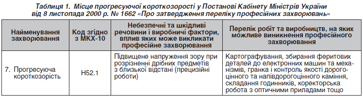 Прогресуюча короткозорість виділена як професійне захворювання відповідно до Постанови Кабінету Міністрів України від 8 листопада 2000 р. № 1662 «Про затвердження переліку професійних захворювань» (табл. 1). Наведена у розділі IV «Захворювання, пов’язані з фізичним перевантаженням та перенапруженням окремих органів і систем», пункт 7.