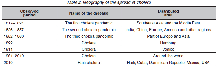 The world’s first cholera pandemic occurred in Southeast Asia, near Calcutta, India, in 1817–1824, and was first called the Asian cholera pandemic (Table 2) because during this period, cholera was widespread in a very large part of the Asian continent. It began near Calcutta and covered areas from Southeast Asia, the Middle East, East Africa and the Mediterranean coast of Europe. Because of this pandemic, millions of people died, creating a great tragedy for huma-nity [8].