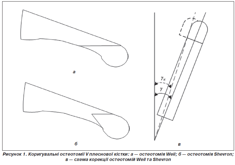 Для усунення вальгусної деформації V плеснової кістки (нормалізація кута M4M5) найчастіше використовують коригувальні остеотомії Weil та Shevron. Схеми виконання цих остеотомій наведені на рис. 1.