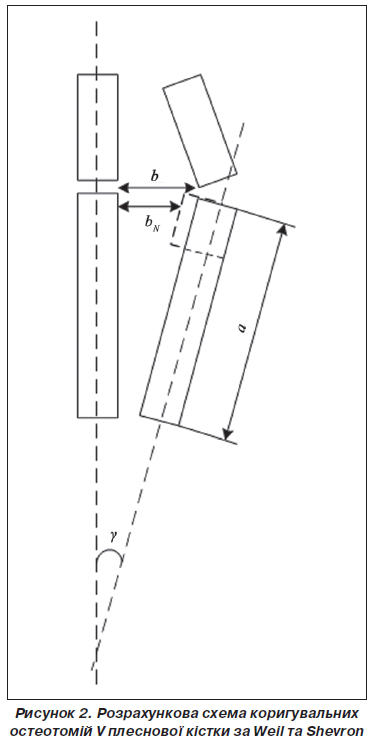 кутову деформацію можна компенсувати лінійним зміщенням головки плеснової кістки. Оскільки зміщення головки виконують у горизонтальній площині, обидві остеотомії у даному випадку працюють абсолютно однаково. Різниця полягає тільки в складності виконання та надійності фіксації кісткових фрагментів дистального метафізу плеснової кістки після виконання її остеотомії. Розрахункова схема цих остеотомій наведена на рис. 2.
