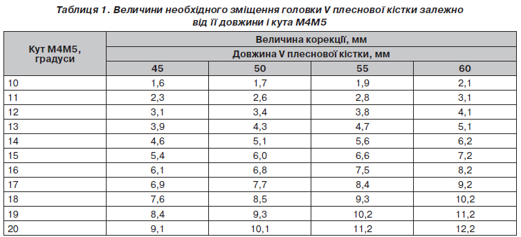 Якщо прийняти діапазон зміни кута між IV та V плесновими кістками від 10 до 15°, а діапазон довжини V плеснової кістки від 45 до 60 мм залежно від анатомічної будови стопи пацієнта, то, підставивши відповідні значення в рівняння (5), отримаємо величину зміщення головки V плеснової кістки, необхідного для відновлення нормальної величини кута між IV та V плесновими кістками 8° при виконанні остеотомії Weil або остеотомії Shevron. Результати розрахунків наведені в табл. 1.