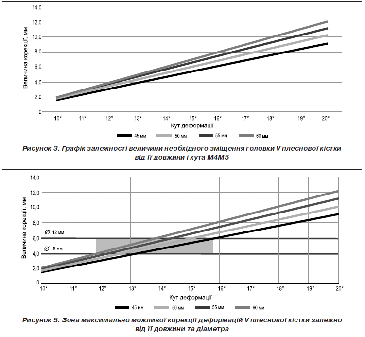 Графік, наведений на рис. 3, надає наочне уявлення про величини необхідного зміщення головки V плеснової кістки залежно від її довжини і кута M4M5.