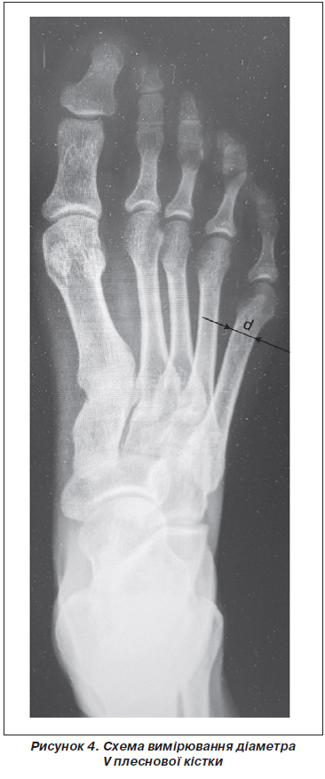 Для визначення варіації товщини V плеснової кістки у дистальному відділі було оброблено 39 цифрових рентгенограм стоп пацієнтів. Схема вимірювання наведена на рис. 4.