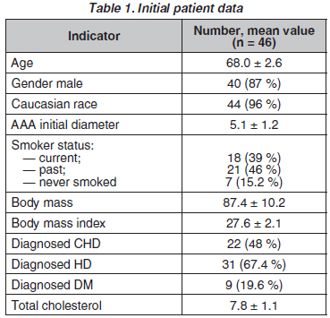 Since January 2018, 46 cases of ruptured AAAs have been diagnosed. In all forty-six cases, surgical intervention was used: either open surgery or endovascular technique. All 100 % of patients had a previous history of diagnosed abdominal aortic aneurysm, for which they underwent periodic ultrasound examination. Baseline data of patients with AAA are presented in Table 1. It is notable that most patients were male, of Caucasian race, which confirms the general data of the World Health Organization (WHO). In addition, all the subjects were elderly people with a previous history of aneurysm. Thus, the average diameter of the aneurysm among the subjects was about 5 cm. Almost all subjects (85 %) smoked in the past or still smoke. The body mass index for the patients varied within narrow limits, all the patients had excess body weight and an elevated level of total cholesterol. About half of the patients had medical conditions of coronary heart disease, hypertensive disease, or diabetes as concomitant diagnoses to the threatening condition — AAA.