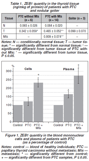 Рівень ZEB1 у тканині папілярної карциноми щитоподібної залози, метастазах, мононуклеарних клітинах крові та плазмі