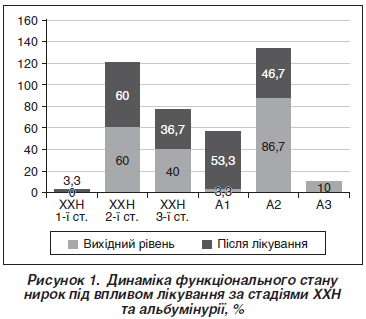 Background. The article presents data on the possibilities of using nutraceutical assistance in the treatment of chronic kidney disease (CKD) in patients with type 2 diabetes mellitus, namely Lespedeza capitata and artichoke. The purpose of our study was to determine the possibility of correcting the functional state of the kidneys in patients with type 2 diabetes mellitus using a combined preparation of Lespedeza capitata and artichoke. Materials and methods. The study involved 30 patients, 18 women and 12 men. The duration of type 2 diabetes mellitus was 9.03 ± 1.51 years. The average level of glycated hemoglobin was 7.16 ± 0.23 %. All patients underwent an assessment of the functional state of the kidneys using the estimated glomerular filtration rate (eGFR) by creatinine level according to the CKD-EPI creatinine equation, as well as the determination of albuminuria as albumin to creatinine ratio (ACR). As a therapy, a 2-month course was prescribed with a combined preparation of Lespedeza capitata and artichoke, 1 capsule 2 times a day. Results. After 2 months of treatment with Libera forte, a significant improvement in albuminuria was noted from 212.17 ± 23.20 mg/g to 62.0 ± 14.6 mg/g (p = 0.036), with no diagnosis of stage A3 after treatment, and an increase in the percentage of patients with stage A1. An improvement in eGFR was also noted from 61.63 ± 2.55 ml/min/1.73 m2 to 64.57 ± 2.77 ml/min/1.73 m2 (p = 0.43), but the data were not significant, although after treatment, 3.3 % of the examined patients had normal eGFR. Conclusions. A significant decrease in ACR and stable eGFR in patients with type 2 diabetes and CKD stages 2 and 3 allow us to consider the inclusion of the combined drug Libera forte in the comprehensive therapy as a potential nephroprotector.