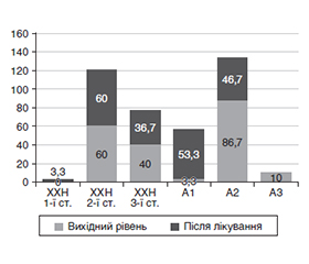 Актуальність. У статті наведені дані щодо можливостей використання нутрицевтичної підтримки у лікуванні хронічної хвороби нирок (ХХН) у пацієнтів з цукровим діабетом 2-го типу, а саме леспедези головчастої та артишоку. Метою нашого дослідження було з’ясувати можливість корекції функціонального стану нирок у пацієнтів з цукровим діабетом 2-го типу за допомогою комбінованого препарату леспедези головчастої та артишоку. Матеріали та методи. У дослідженні взяли участь 30 пацієнтів, із них 18 жінок та 12 чоловіків. Тривалість цукрового діабету 2-го типу — 9,03 ± 1,51 року. Середній рівень глікованого гемоглобіну становив 7,16 ± 0,23 %. Усім пацієнтам проведена оцінка функціонального стану нирок за допомогою розрахункової швидкості клубочкової фільтрації (рШКФ) за рівнем креатиніну (формула CKD-EPI Createnine), а також визначення альбумінурії як співвідношення альбуміну та креатиніну (САК). Як терапію призначили комбінований препарат леспедези головчастої та артишоку по 1 капсулі 2 рази на добу, курс лікування 2 місяці. Результати. Через 2 місяці лікування препаратом Лібера форте відмітили вірогідне поліпшення показника альбумінурії з 212,17 ± 23,20 мг/г до 62,0 ± 14,6 мг/г (р = 0,036), відсутність діагностування стадії А3 і збільшення відсотка пацієнтів зі стадією А1. Також відмітили поліпшення рівня рШКФ з 61,63 ± 2,55 мл/хв/1,73 м2 до 64,57 ± 2,77 мл/хв/1,73 м2 (р = 0,43), але ці дані суттєво не значущі, хоча після лікування у 3,3 % обстежених фіксували нормальні показники рШКФ. Висновки. Вірогідне зниження САК і стабільні показники рШКФ у пацієнтів з цукровим діабетом 2-го типу та ХХН 2-го та 3-го ступеня дають змогу розглядати додавання комбінованого препарату Лібера форте в комплексну терапію як потенційного нефропротектора.