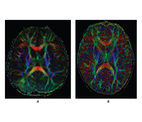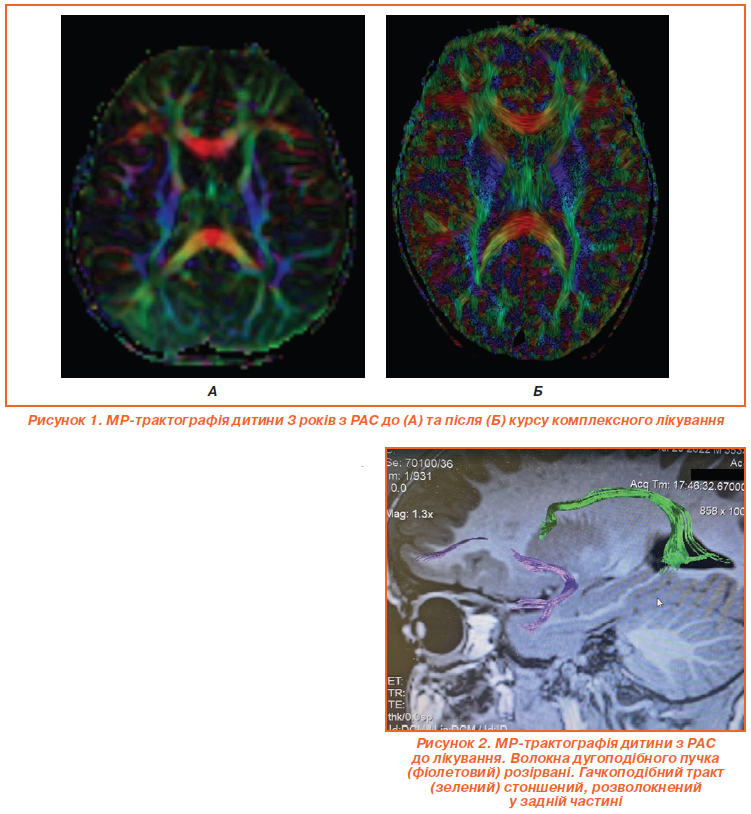 Для оцінки ефективності лікування застосовувалась МР-трактографія (рис. 1, 2). Рис. 1А відображає МР-трактографію мозку дитини 3 років з розладом аутистичного спектра (РАС) до лікування, видно характерні порушення в організації білої речовини. На аксіальному зрізі мозолисте тіло, представлене помаранчево-червоною дугоподібною структурою, виглядає стоншеним і асиметричним, з розривами трансверсальних волокон, що вказує на ослаблену міжпівкульну комунікацію, типову для РАС. Фронтальна ділянка з зеленими та жовтими асоціативними трактами, як-от superior longitudinal fasciculus, містить розірвані V-подібні структури з низькою щільністю, що корелює з труднощами в соціальній взаємодії та мовленні. У потиличних відділах візуалізуються фрагментовані inferior fronto-occipital fasciculus, а синьо-фіолетові кортикоспінальні тракти сформовані нерівномірно, що проявляється затримкою моторних навичок. Дугоподібні тракти (arcuate fasciculus) розірвані (рис. 2) та мають знижену фракційну анізотропію, що є маркером аномальної нейронної конективності при РАС.