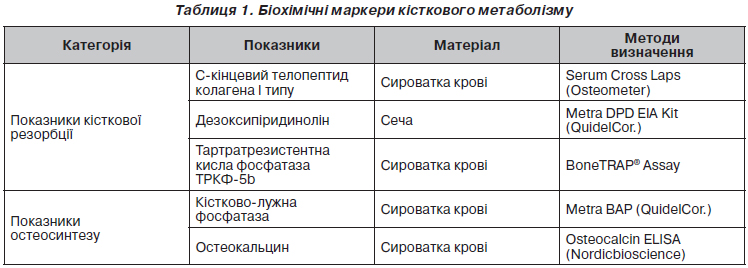 Вивчали біохімічні маркери кісткової резорбції і остеосинтезу (табл. 1): С-кінцевий телопептид (СТХ) сироватки крові, дезоксипіридинолін (ДПІД) сечі, тартратрезистентну кислу фосфатазу (ТРКФ-5Ь); кісткову лужну фосфатазу (КЛФ) сироватки крові, остеокальцин (ОК) сироватки крові.