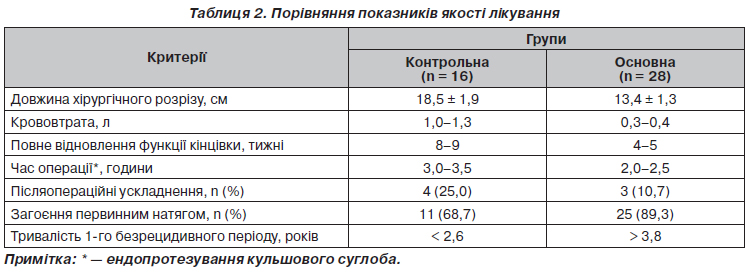 Порівняння впливу варіантів планування і тренувань в основній та контрольній групах на показники якості ендопротезування (проаналізовано мінімальний набір очевидних показників) наведено у табл. 2.