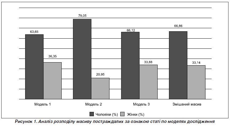 Background. One of the main causes of death and disability of the population in Ukraine is traffic accidents. In addition, in 2022–2023, the number of fatal traffic accidents increased. The purpose was to determine the peculiarities of the clinical and epidemiological characteristics of traffic injuries as medical and sanitary consequences of emergencies in the components of the totality of the phenomenon (traffic accident). Materials and methods. The actual material of the study was 1,696 cases of traffic injuries, which were selected by the method of irreversible randomization. The study was conducted in 2019–2020. This array was distributed according to the conditions of an epidemiological experiment on natural models, which was formed in accordance with the requirements and criteria of the law of large numbers. Model 1 is a metropolis. This model includes victims who were injured and were treated in a metropolis (population of more than 1,000,000). Model 2 — rural area. This model includes victims who were injured in rural areas and were treated at a central district hospital. Model 3 is a regional city. This model includes victims who were injured in the city (population of 300,000–500,000). Results. As a result of the study, it was found that in all research models there was a significant advantage of injured men over women, but this indicator was the highest in model 2 (rural area) — 79.05 %. Indicators in model 1 (metropolis) and in model 3 (regional city) were practically equivalent to the indicator of the mixed regime (63.65, 66.12 and 66.86 %, respectively). The fact that the specific weight of those who survived prevails over that of the deceased in both gender groups in all research models is also noteworthy. The mortality was highest in men and women who were injured as a result of road accidents in rural areas (34.54 and 31.82 %, respectively), the lowest in men of model 2 (regional city; 3.75 %) and in women of model 1 (metropolis; 3.38 %). Also, the comparative analysis showed that the victims in the age group of 21–30 years rank first in all research models. People of working age (21–50 years old) among the victims of road accidents make up 66.81 % in model 1, 58.10 % in model 2, and 53.69 % in model 3. It was found that in almost all age groups, except for those older than 71 years, the highest mortality was observed in model 2 (rural area). The mortality in all study models was highest in the age group over 71 years: model 1 — 16.41 %, model 2 — 44.44 %, model 3 — 60.00 %. The lowest mortality was in model 1 in the age group of 21–30 years (2.17 %), in model 2 in the age group of 61–70 years (24.14 %), in model 3 in the age group of 21–30 years (7.02 %). Conclusions. The clinical and epidemiological characteristics of traffic injuries have specific features for metropolis, rural area, and regional city, which is a sign of certain differences in the infrastructure of models and the lifestyle of the population. All research models are characterized by the predominance of men, but this is especially pronounced in model 2 (rural area) — 79.05 %. The age factor has a significant influence on the formation of the array of victims in the research models, the largest specific weight in all models belongs to people of working age, which is most pronounced in the metropolis — 77.87 %. Age has a significant impact on the outcome of the traumatic process in all research models and is most pronounced in older age groups. The largest array of victims of working age with a negative course of the traumatic process was in rural areas — 75.70 %. Comparative clinical and epidemiological analysis of road traffic injuries in research models indicate the similarity of characteristics to developing countries.