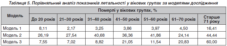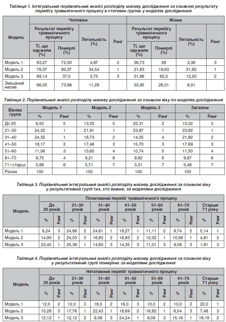 Актуальність. Однією з основних причин смертності та інвалідизації населення в Україні є дорожньо-транспортна пригода (ДТП), крім того, за 2022–2023 роки кількість дорожньо-транспортних пригод із смертельними наслідками збільшилася. Мета дослідження: визначити особливості клініко-епідеміологічних характеристик дорожньо-транспортної травми як медико-санітарних наслідків надзвичайної ситуації у компонентах генеральної сукупності явища (ДТП). Матеріали та методи. Фактичним матеріалом дослідження були 1696 випадків дорожньо-транспортної травми, які було обрано методом незворотної рандомізації. Дослідження проводилося в період 2019–2020 років. Даний масив було розподілено відповідно до умов епідеміологічного експерименту на моделях натурного типу, що було сформовано відповідно до вимог та критеріїв закону великих чисел. Модель 1 — мегаполіс. До цієї моделі ввійшли постраждалі, які отримали травму й проходили лікування в мегаполісі (населення більше ніж 1 000 000). Модель 2 — сільська місцевість. До цієї моделі включено постраждалих, які отримали травму в сільській місцевості й проходили лікування в центральній районній лікарні. Модель 3 — обласне місто. До цієї моделі включено постраждалих, які отримали травму в місті (населення 300 000–500 000). Результати. У результаті дослідження встановлено, що в усіх моделях дослідження існує суттєва перевага травмованих чоловіків над особами жіночої статі, але такий показник найбільший у моделі 2 (сільська місцевість) — 79,05 %. Показники у моделі 1 (мегаполіс) та у моделі 3 (обласне місто) практично рівнозначні показнику змішаного режиму (63,65; 66,12 та 66,86 % відповідно). Привертає увагу і той факт, що показник питомої ваги тих, хто вижив, превалює над показником питомої ваги померлих в обох гендерних групах у всіх моделях дослідження. Найбільша летальність — у чоловіків та жінок, які отримали травму внаслідок ДТП у сільській місцевості (34,54 та 31,82 % відповідно), а найменша летальність — у чоловіків моделі 2 (обласне місто, 3,75 %) та у жінок моделі 1 (мегаполіс, 3,38 %). Також у результаті порівняльного аналізу встановлено, що на першому ранговому місці в усіх моделях дослідження перебувають постраждалі вікової групи 21–30 років. Люди працездатного віку (21–50 років) серед постраждалих унаслідок ДТП становлять у моделі 1 — 66,81 %, у моделі 2 — 58,10 %, а у моделі 3 — 53,69 %. Визначено, що майже в усіх вікових групах, крім вікової групи старше 71 року, найбільша летальність спостерігається у моделі 2 (сільська місцевість). Найвища летальність у всіх моделях дослідження зафіксована у віковій групі старше 71 року: модель 1 — 16,41 %, модель 2 — 44,44 %, модель 3 — 60,00 %. Найнижча летальність — у моделі 1 у віковій групі 21–30 років (2,17 %), у моделі 2 — у віковій групі 61–70 років (24,14 %), у моделі 3 — у віковій групі 21–30 років (7,02 %). Висновки. Клініко-епідеміологічна характеристика дорожньо-транспортної травми має специфічні особливості для мегаполіса, сільської місцевості та обласного міста, що є ознакою певних відмінностей інфраструктури моделей та життєдіяльності населення. Для всіх моделей дослідження характерно превалювання осіб чоловічої статі, але особливо це виражено у моделі 2 (сільська місцевість) — 79,05 %. Вікова ознака має суттєвий вплив на формування масиву постраждалих у моделях дослідження, найбільшу питому вагу в усіх моделях мають особи