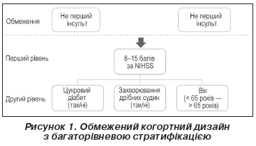 Для коригування даних щодо віку, наявності діабету та захворювань дрібних судин було проведено стратифікацію другого рівня за допомогою об’єднання Кохрана — Мантеля — Хензеля [28] (рис. 1). Відповідно до принципів ДПЕ для подальшої мінімізації впливу різних факторів було використано обмежений когортний дизайн шляхом виключення пацієнтів з інсультом в анамнезі або з інвалідністю (mRS > 1) [27].