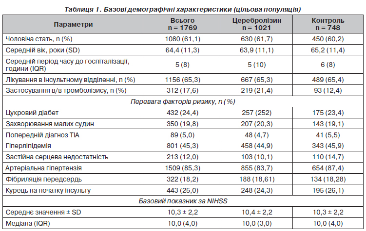 Було продемонстровано, що Церебролізин, нейропептидний препарат з мультимодальною активністю, імітує активність ендогенних нейротрофічних факторів. Таким чином, він сприяє церебропротекції, нейропластичності та нейрогенезу, модулюючи відповідні шляхи передачі сигналів, такі як PI3K/Akt, Sonic Hedgehog та MAPK/ERK. Він поліпшує цілісність гематоенцефалічного бар’єра, зменшує запалення та демонструє ефективність у поліпшенні функціональних, а також когнітивних результатів у моделях інсульту [15–18]. Дослідження Церебролізину та відновлення після інсульту (CARS) продемонструвало вірогідне поліпшення рухової функції та загального результату у пацієнтів, яким проводилося лікування Церебролізином та рухова реабілітація, порівняно з групою плацебо; показник необхідної кількості пацієнтів для лікування в цьому дослідженні становив 7,1 для клінічно вірогідних змін у ранньому неврологічному відновленні [19, 20]. У пацієнтів, які страждали на нефлюентну афазію після інсульту (дослідження ESCAS), лікування Церебролізином призвело до вірогідного поліпшення відновлення мовлення та зменшення неврологічного дефіциту [21]. Метааналізи підтвердили корисний вплив Церебролізину на раннє неврологічне відновлення та безпеку препарату [22–24]. Кілька настанов рекомендують використовувати Церебролізин для нейрореабілітації після інсульту [25, 26]. З огляду на попередні результати метою нашої роботи була оцінка ефективності лікування Церебролізином у реальних умовах у пацієнтів із гострим інсультом середнього ступеня тяжкості.