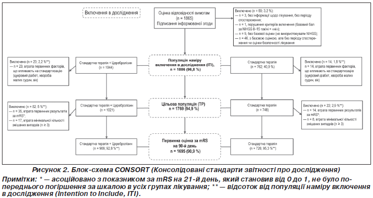 З огляду на схвалення Церебролізину приблизно в 60 країнах, було розпочато масштабне багатонаціональне обсерваційне контрольоване дослідження ефективності, проведене в реальних умовах. Хоча рандомізовані конт–рольовані дослідження вважаються золотим стандартом клінічних досліджень, обсерваційні дослідження демонструють значну перевагу ширшого відбору пацієнтів та підвищеної зовнішньої валідності [6]. Такі дослідження точніше відображають рутинну клінічну практику, поліпшуючи узагальнення результатів та надаючи цінний набір даних для прийняття рішень регуляторними органами та органами з оцінки медичних технологій.