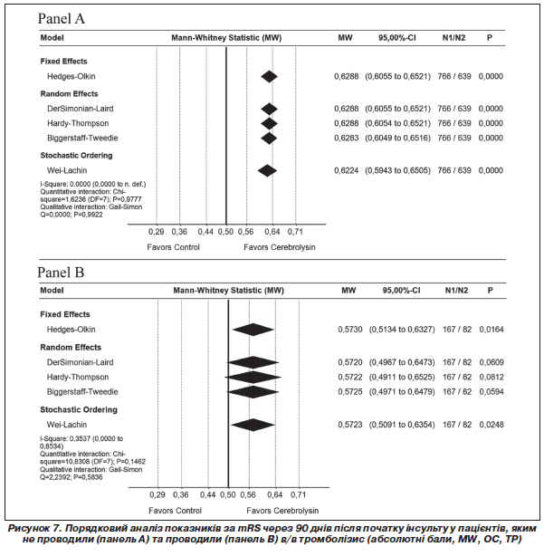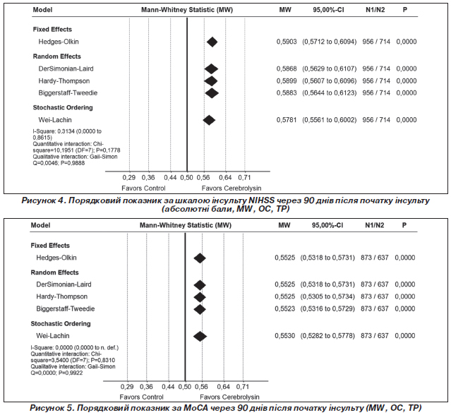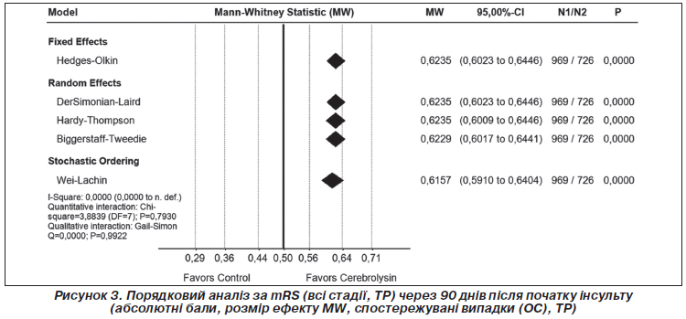 Попередньо запланований аналіз даних за mRS як первинного результату з використанням показника розміру ефекту MW показав статистично вірогідну помірну або середню перевагу лікування Церебролізином порівняно з групою контролю (MW 0,6157; 95% ДІ 0,5910–0,6404; P < 0,0001; I2 = 0,0000; рис. 3).