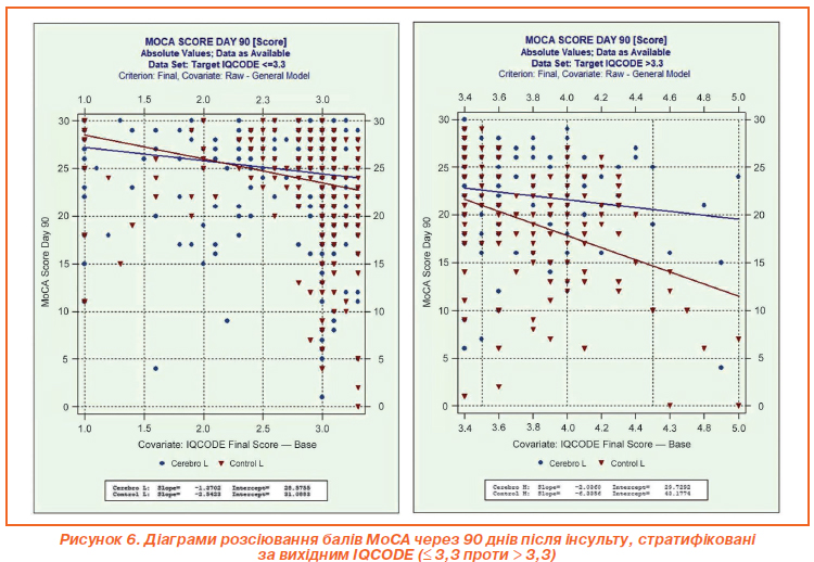 Постінсультні когнітивні порушення є поширеним наслідком інсульту та можуть суттєво вплинути на результати лікування пацієнтів з інсультом та на стан осіб, які за ними доглядають. Постінсультні когнітивні порушення найбільш поширені протягом першого року після інсульту, їх частота становить до 60 % [48]. Оцінка когнітивних функцій в постінсультному періоді за допомогою MoCA через 90 днів також показала сприятливий вплив Церебролізину, особливо у пацієнтів з підозрою на когнітивне зниження до інсульту (IQCODE > 3,3). Цей висновок добре узгоджується з попередніми дослідженнями, що демонстрували переваги Церебролізину щодо когнітивних функцій [49, 50] у різних групах пацієнтів. З огляду на цей факт подальші дослідження [51–53], спрямовані на вивчення довгострокового впливу Церебролізину на когнітивні показники у пацієнтів після інсульту, тривають, а результати очікуються у 2026 році [21, 54].