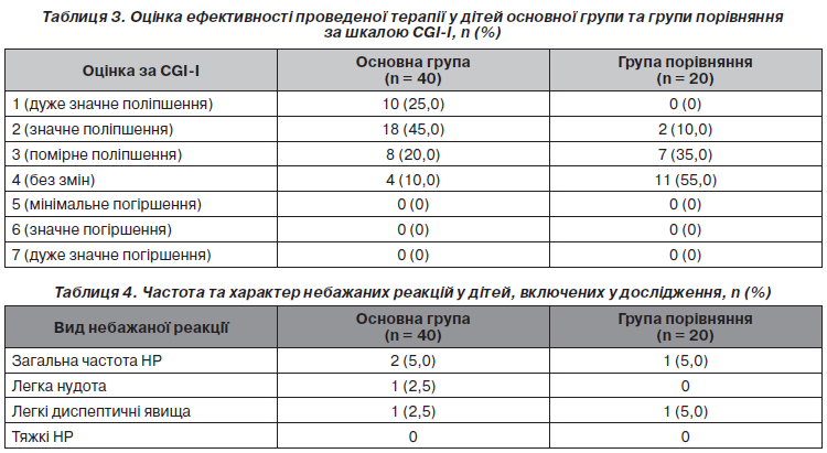 Оцінка ефективності лікування проводилася лікарем за 7-бальною шкалою CGI-I, що відображає ступінь загального клінічного поліпшення та показала значну перевагу основної групи (табл. 3).