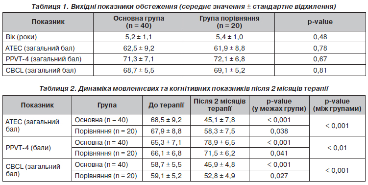 До початку дослідження обидві групи були порівнянні за основними демографічними показниками (вік, стать) і тяжкістю порушень мовленнєвого та когнітивного розвитку. Усі 60 дітей мали в анамнезі досвід травматичних подій, пов’язаних із війною, що проявлялося погіршенням психоемоційного стану, а також розвитком або посиленням наявних порушень мовленнєвого та когнітивного розвитку. Статистично значущих відмінностей між групами на початковому етапі не виявлено (p > 0,05).